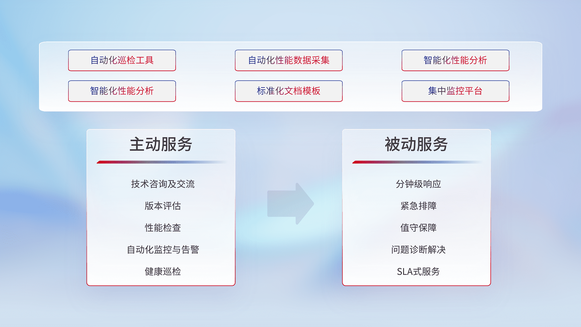 智能化工具和标准化文档,,,保障服务质量,,提供主动服务(包含技术咨询、、、、版本评估、、、性能检查、、自动化监控与告警、、、、健康巡检)和被动服务包含(分钟级响应、、紧急排障、、值守保障、、、、问题诊断解决、、、、SLA服务)。。。