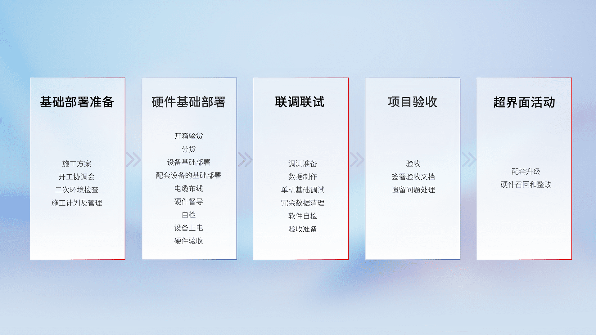 从基础部署准备、、硬件基础部署、、、、联调联试、、、项目验收、、越界面活动的全过程可追溯,,,保证施工质量和进度。。。。